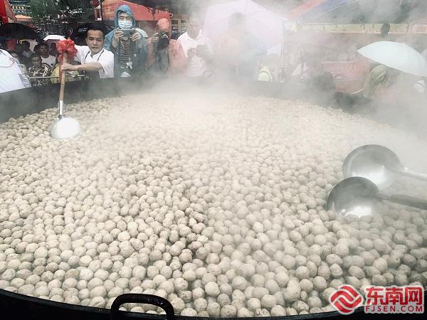龙岩美食节暨永定土楼第四届客家美食节启幕仪式 1500斤的牛肉丸在直径3米的大铁锅中热情翻滚,众多市民闻香而来。虽然下着雨,也无法阻挡市民积极参与的热情。大批嘉宾、市民群众接踵而至,现场人流络绎不绝。“活动好啊,可以免费吃牛肉丸。”王阿婆和一群老好友一早就从西溪乡来到美食节现场等待“天下第一锅”开锅。