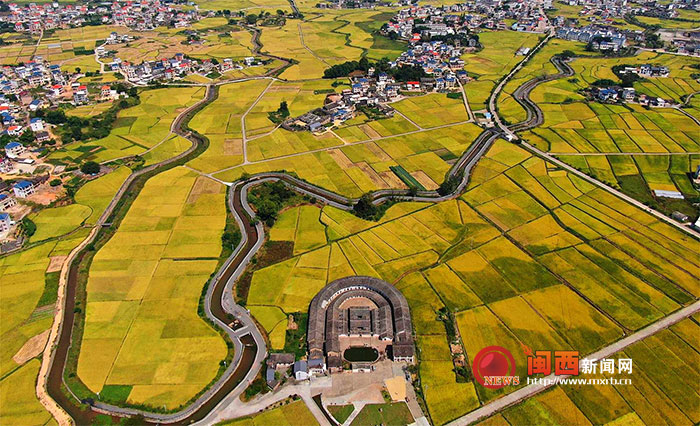 东南网龙岩10月20日讯 据闽西新闻网报道 龙岩市上杭县农技部门今年在庐丰乡丰济村实施优质稻示范基地200亩,带动规模1000亩,以优质稻品种、播种育秧、插秧、测土配方施肥、病虫害统防五统一,全程机械化耕作,目前丰收在望即将收割,有望平均亩产600公斤。图为19日航拍的丰济村千亩优质稻丰收场景。