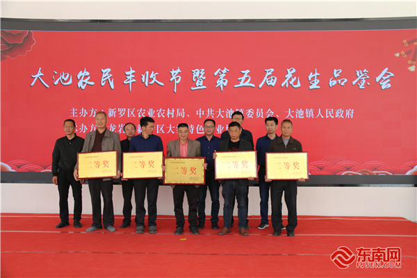 图为新罗大池镇农民丰收节暨第五届花生品鉴会活动现场。 活动现场,专家评审根据花生的外形、品相、口感、味道等方面进行仔细认真地品鉴、打分,经过层层筛选,最终评出金奖1名、一等奖2名、二等奖5名、三等奖10名。