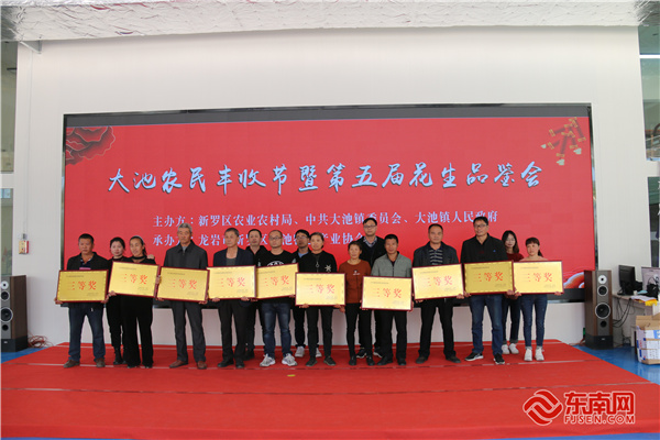 图为为第五届花生品鉴会三等奖得主颁奖。 大池镇党委书记陈观连介绍道,“我们连续举办五届花生品鉴会,就是希望搭建一个种植、加工户交流的平台,以‘大池花生’特色品牌建设引领质量提升,同时做好龙池产业园特色农产品深加工、电子商务、冷链物流体系建设,推动大池特色农业产业集约、高效、优质、规范发展,实现联农带农富农。” 据悉,大池花生主要集中在大山,南燕,黄美,雅金,西洋等五个村种植,全镇种植花生农户1600余户,占全镇农户的40%,种植花生面积达2200亩,年加工咸酥花生80万斤,总产值约1440万元。