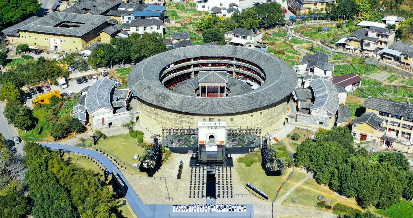 “三楼一线”之振福楼——迎新贺岁“三楼”之中的“振福楼”,素有“土楼公主”之名,亦被称为“振成楼”的“姐妹楼”。“振福楼”位于永定区南溪土楼群内,所在处依山傍水,风景秀丽,也因此常常成为影视作品或艺术创作者们采风取景地。