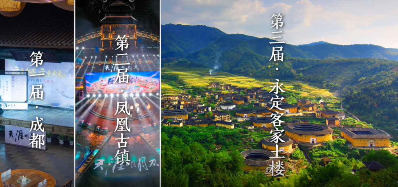 天刀携手永定土楼,开启数字IP文旅战略合作此次双方战略合作的核心内容,是围绕“振成楼”、“环兴楼”、“振福楼”等三座客家土楼所展开的“三楼一线”系列文旅合作项目,以及相关的线上文创内容。 “三楼一线”之振成楼——合作起航“三楼”之中的“振成楼”,以富丽堂皇、中西合璧的空间设计精致多变而著称。1985年,其建筑模型与北京天坛作为中国南北圆形建筑代表,参加美国洛杉矶世界建筑展览会,引起轰动,并因此获得了“东方建筑明珠”的美誉。这座融合了东西方古典建筑设计美学的土楼,也顺理成章成为了此次《天涯明月刀》与永定土楼战略合作发布会的举办地。