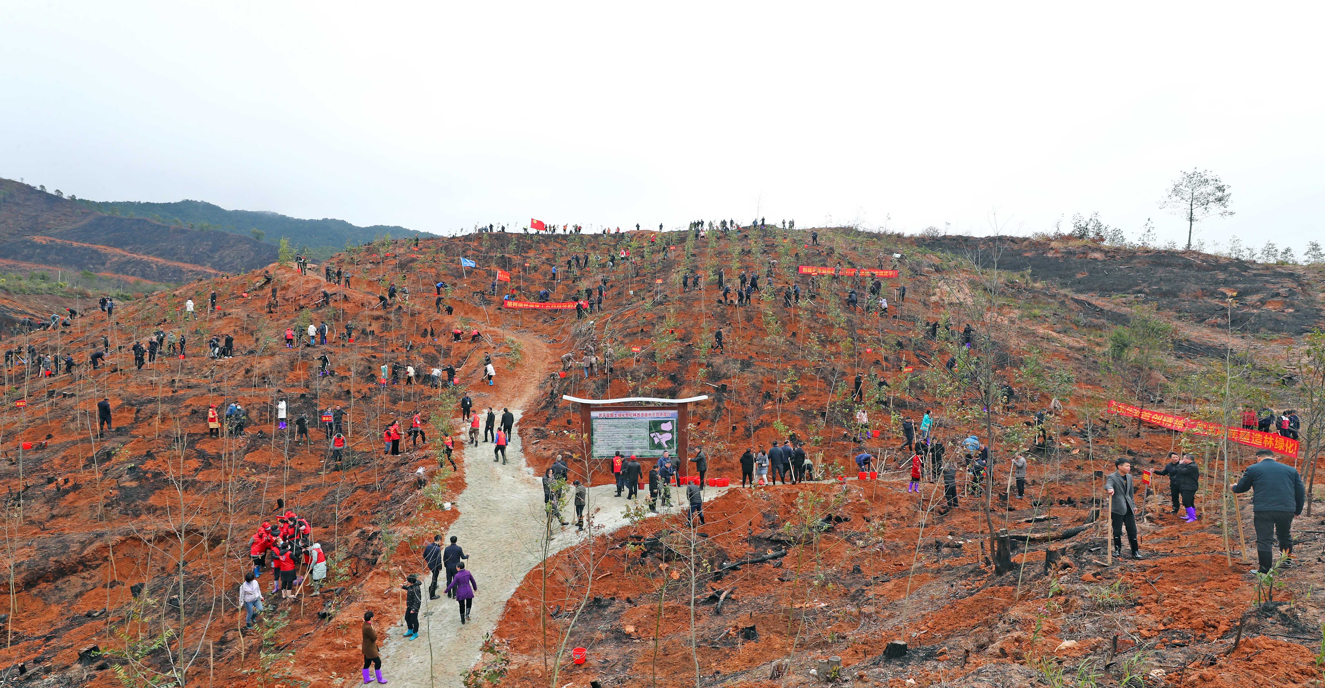 2月24日,李建成等市领导在武平参加义务植树活动。王毅 摄 东南网龙岩2月25日讯 据闽西新闻网报道 今年是习近平总书记对武平林改作出重要指示20周年。青山不老、岁月常新,又到春风拂绿的季节,2月24日上午,李建成、詹昌建、李桂义、袁平华、石海东、杨溢、黄立峰、陈厦生、汤孔忠、张琼珊、陈泽亮、廖深洪、简洪坤、郑玉琳、陈晓东、赖双奇、张凌、卢敏云、温永等市领导和龙岩军分区领导,以及市法院院长王孔坚、市检察院检察长李航来到武平县万安镇,与市县机关干部、部队官兵、当地群众一起参加义务植树活动。 当天的植树点位于万安镇下镇村长坑里山场,是武平县国土绿化暨松林改造提升示范点。该示范点通过对原马尾松纯林进行皆伐改造,采取混交方式,优化林分结构,精准提升森林质量,构建健康、稳定、高效的森林生态系统;同时,充分利用马尾松伐根(树兜)套种中药材茯苓发展林下经济,增加林农收入,助力乡村振兴,促进共同富裕。 连续几天的春雨,让山野绿意更浓、生机勃发。市领导来到植树点,立刻投入劳动中,挥锄挖土、扶正树苗、踩紧压实、提桶浇灌……每一道工序都做得一丝不苟。现场的干部群众和部队官兵,分工配合、齐心协力,栽下一棵棵枫香、木荷、闽楠、红椎、千年桐、米老排、杉木等乡土树种。 李建成边种树边向武平县和市林业局负责同志了解工作情况,强调要深入贯彻习近平总书记对捷文村群众来信重要指示精神,传承弘扬林改经验,发扬林改首创精神,进一步推动林改创新发展。要按照实施“提高效率、提升效能、提增效益”行动的要求,注重质量效果,强化示范带动,趁着大好春光在全市迅速掀起春季造林绿化和全民义务植树的热潮。要持续深入践行绿水青山就是金山银山的理念,积极开展首创性、差异化改革实践,积极探索促进山区共同富裕的有效路径,着力推动高质量发展、创造高品质生活。 逢春添新绿,种下新希望。据悉,今年以来,龙岩市统筹推进国土绿化美化,抢抓林时加快植树造林,全力确保3月底完成造林绿化19万亩,全年完成松林改造50万亩。截至目前,已完成造林10.56万亩,占任务的55.6%;已完成松林改造16万亩,占任务的32%。