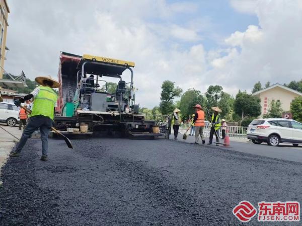 东南网龙岩8月16日讯(通讯员 黄爱娣 张定焜)在永定区高头镇承启楼至湖坑镇振成楼段路面改造工程现场,一台台摊铺机正在半幅铺设路面,新铺的黑色沥青滋滋地冒着热气,紧跟摊铺机的是胶轮压路机来回碾压。