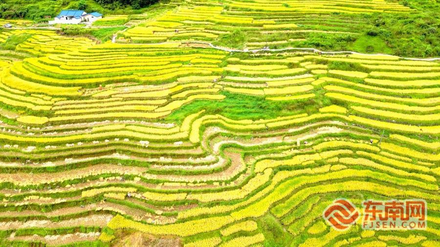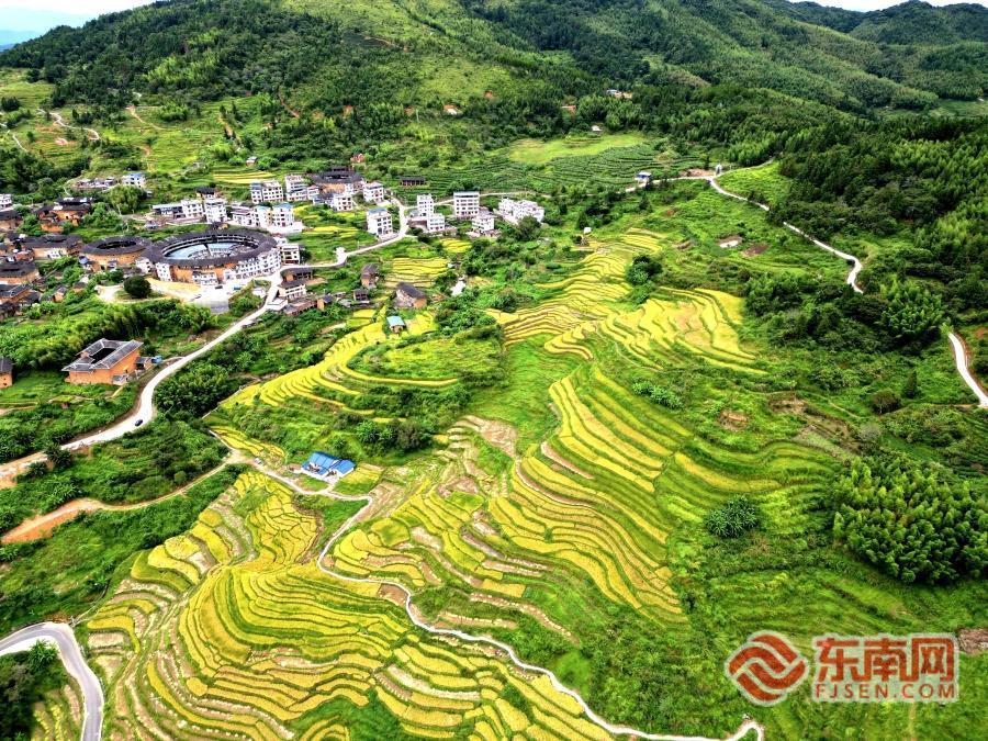 线条分明的金色梯田与青山绿水、古朴土楼交相辉映,勾勒出静谧秀美的田园画卷,引得不少游客驻足打卡。