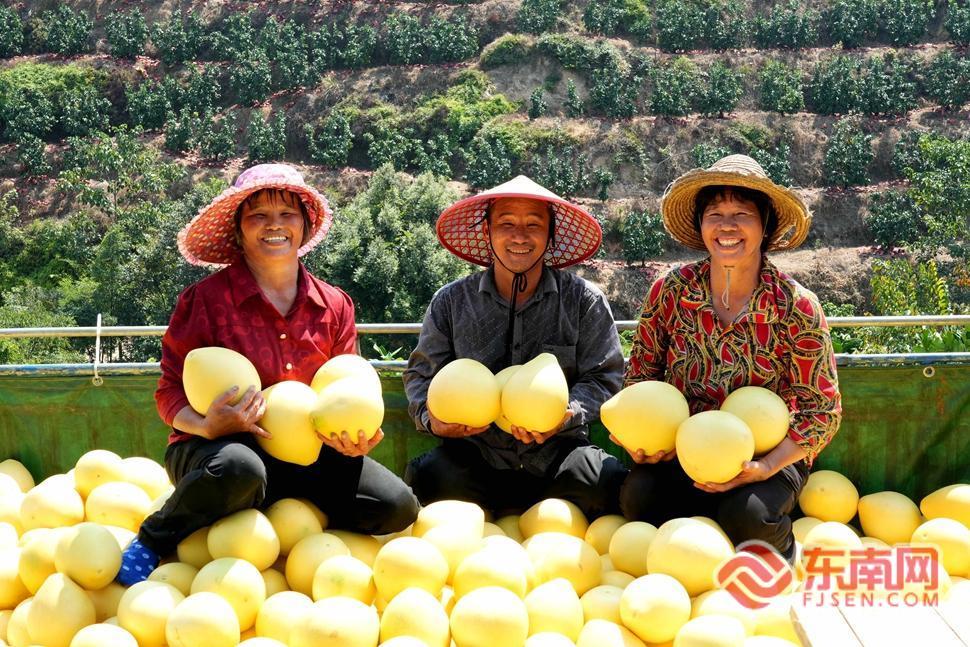 永定区洪山镇田梓村数千亩的蜜柚种植基地里,山坡与平地上的果树整齐排列,一颗颗圆鼓鼓、沉甸甸的蜜柚压弯枝头,柚子丰收,果农笑开颜。永定区融媒体中心供图