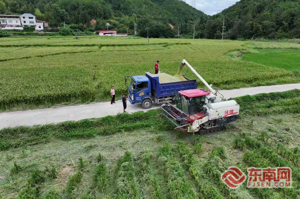 上杭县湖洋镇岩头村的连片高标准农田里,收割机正在紧张作业。伴随着轰鸣声,一排排制种水稻被整齐地收割、脱粒,装进运输车辆中。上杭县融媒体中心供图