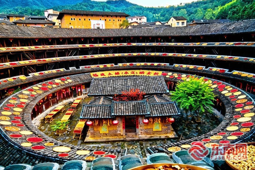 在永定初溪土楼群的集庆楼内,数十个木质晒架整齐排列,当地村民正忙着将刚收获的农作物晾晒其上。 郑瑜琳摄
