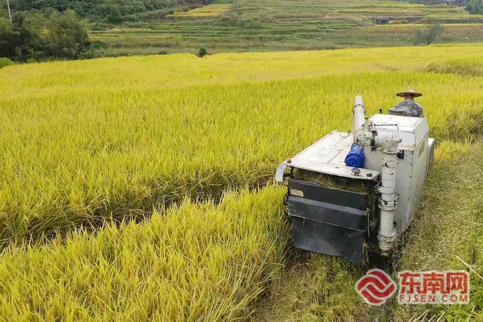 在新罗区万安镇好坑村,收割机在金色稻田里轰鸣穿梭,农户们忙着抢收稻谷,一幅“粮满仓、民安乐”的丰收图景正生动铺展。新罗区融媒体中心供图