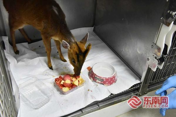 据悉,9月7日上午,一只黄麂误入长汀城区一户居民家中。接到市民报警后,长汀县公安局迅速出警,并及时将黄麂移交长汀县林业部门,并第一时间进行了全面“体检”。经检查发现,这只小黄麂左前腿受伤严重,皮肤撕裂有十多厘米长。为确保黄麂得到妥善救治,工作人员随后将其送至城区一家宠物诊所接受治疗。其间,工作人员对黄麂进行外伤清创及缝合手术,术后安排了安静的生活环境,每天进行了丰富的食物补充,精心帮助其恢复健康。长汀县优格宠物诊所负责人廖明亮告诉记者,刚开始来这边的时候(小黄麂)也会怕,现在待了一个月以后也是比较亲近人,也比较配合,伤口愈合得比较漂亮,已经完全达到了放生标准。