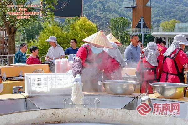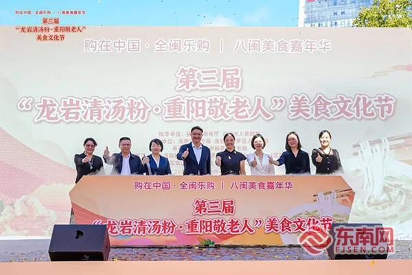 东南网龙岩10月29日讯 岁岁重阳,今又重阳。10月25日,新罗区未来城早早便升腾起热闹烟火气,由龙岩市商务局、新罗区人民政府联合主办、新罗区商务局承办的第三届“全闽乐购·万商云聚惠龙岩”暨“福满重阳·清汤粉美食文化节”火热启幕。 活动现场人声鼎沸、粉香扑鼻、暖情四溢,一口巨型大锅正咕嘟咕嘟冒着热气,新罗老字号商家的师傅手持长勺不停搅拌,醇厚的汤香瞬间弥漫全场。60岁及以上长者凭身份证就能免费领取一碗正宗清汤粉,队伍里不时传来赞叹声。