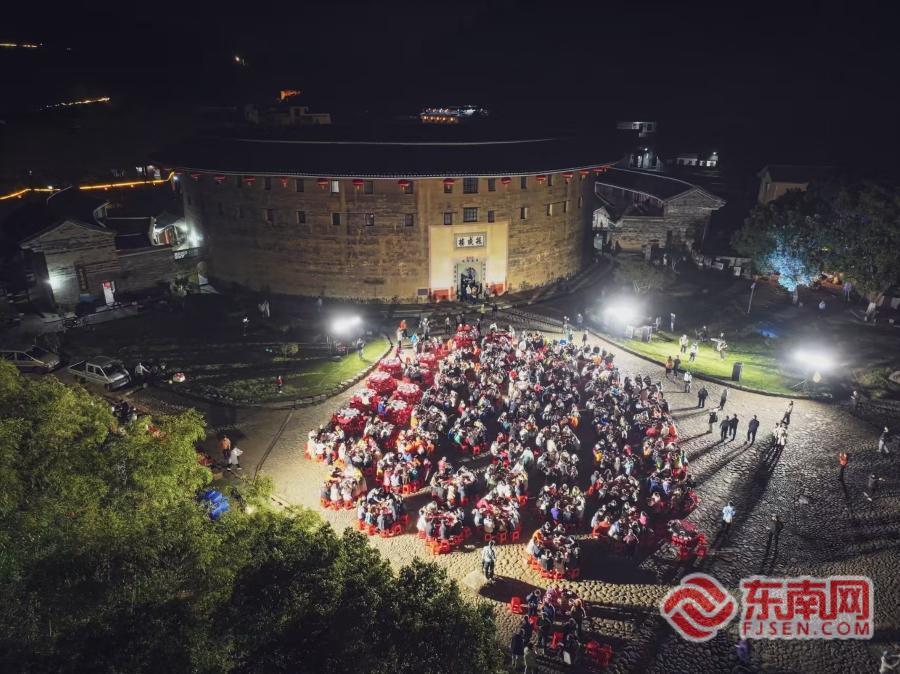 参赛选手赛前在振成楼前共品“土楼大福宴”。章宸睿摄