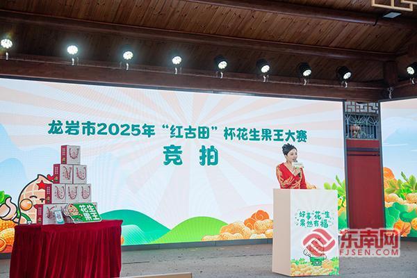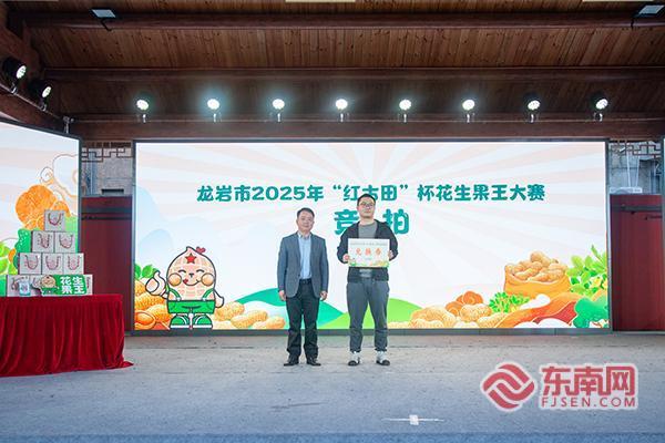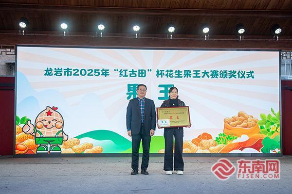 东南网龙岩12月20日讯(本网记者 马伊骅 林雯 文/图)12月20日,龙岩非遗文创园内欢歌载舞、香气四溢。一场以花生为“主角”的丰收盛宴——龙岩市2025年“红古田”杯花生果王大赛颁奖典礼及特色农产品展销活动在此火热上演。活动现场吸引众多农户、企业与市民齐聚一堂,共品花生香,共话丰收情。 本次活动由新罗区人民政府、龙岩市农学会联合主办,大池镇人民政府、新罗区农业农村局、新罗区供销合作社联合社、福建龙岩供销百农汇科技有限公司、福建龙岩弘龙旅游开发有限公司承办。经过前期激烈角逐与专家严谨评审,活动评选出果王1名、金奖2名、银奖3名、铜奖4名、优秀奖4名,并进行颁奖表彰,来自新罗区大池镇的杨恩荣获得今年的果王称号,这不仅仅是一份荣誉,更是对农耕智慧与辛勤汗水最直接的肯定。