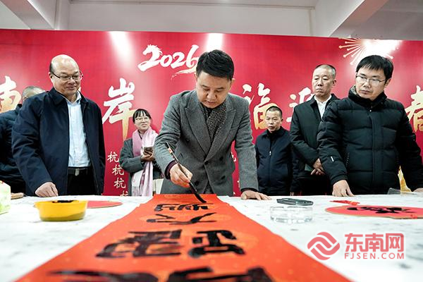 东南网龙岩1月25日讯(通讯员 陈丽媛 黄大伟 本网记者 马伊骅)1月23日,龙岩市上杭县“墨香连两岸 送福迎新春”为台胞台属写春联活动在该县海峡两岸交流基地服务中心举行。10位本土书法家现场挥毫,与在杭台胞台属、岛内青少年学生齐聚一堂,通过笔墨传递祝福,共同迎接新春佳节。 活动现场墨香四溢,红纸铺展,洋溢着浓厚的节日氛围。书法家们专注运笔,一副副寓意吉祥的春联和一个个饱满的“福”字在笔下诞生。 “每年春节都能感受到当地的温暖关怀,今天特意来求一副春联,这不仅是门上的装饰,更是心里的团圆。”在杭台胞曾广丰说,自己深感不论身在何处,根脉始终是相连一致的。