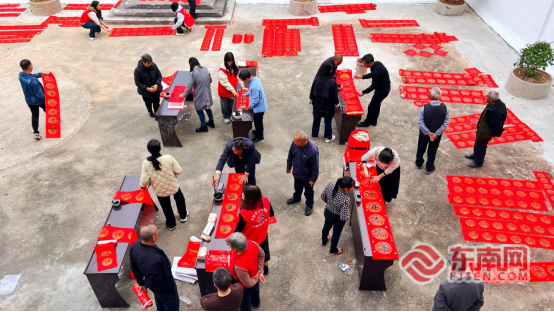 “对于双溪村的留守老人们来说,这不仅仅是一碗粥的温暖。”双溪村党支部书记范锦兰一边忙碌着,一边道出了活动的初衷:“这些老人大多是留守老人,缺少陪伴,我们不光要让他们喝上热乎粥,更想把‘文化年货’送到家门口。一副春联,不仅是吉祥话,更是一种陪伴和尊重,一口腊八粥,暖身更暖心。” 品粥之余,墨香更添年味。来自永定的志愿者和书法爱好者铺开红纸,饱蘸浓墨,笔走龙蛇。“一帆风顺年年好,万事如意步步高”“福如东海长流水,寿比南山不老松”……一副副寓意吉祥的春联、一个个苍劲有力的“福”字,在笔尖下诞生。村民们围在桌前,有的帮忙压纸,有的挑选词句,红纸映着笑脸,构成了一幅最生动的“民俗风情画”。
