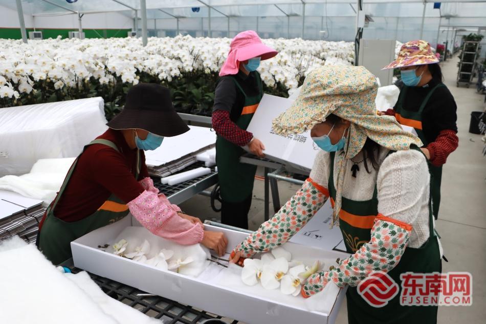 花农在龙潭镇蝴蝶兰基地打包鲜切蝴蝶兰