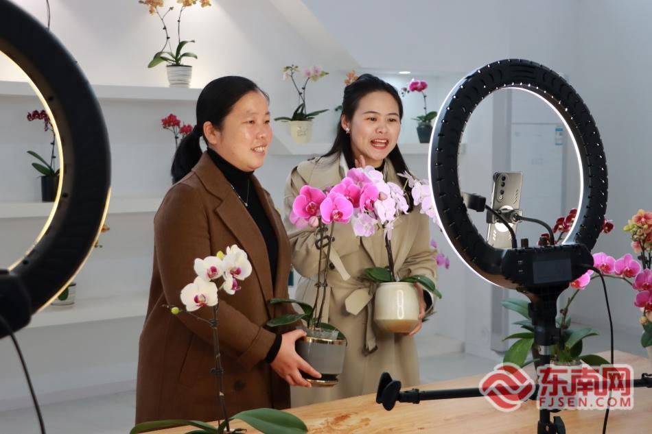 在龙潭镇蝴蝶兰综合展示中心,工作人员通过直播线上销售蝴蝶兰