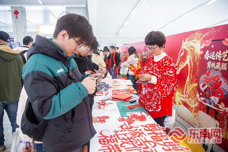 春运首日,龙岩车务段组织开展多项特色活动,营造温馨浓厚的节日氛围。龙岩站候车室内设置非遗剪纸展台,邀请手工艺人现场展示剪纸技艺,旅客可参与互动体验;爱心义剪区为旅客提供免费理发服务,传递旅途温暖;写春联摊位上,书法爱好者现场挥毫,书写吉祥春联与“福”字赠予旅客,送上新春祝福。武平站、上杭站也同步开展形式多样的文艺表演与互动活动,让旅客在出行中感受浓浓年味。