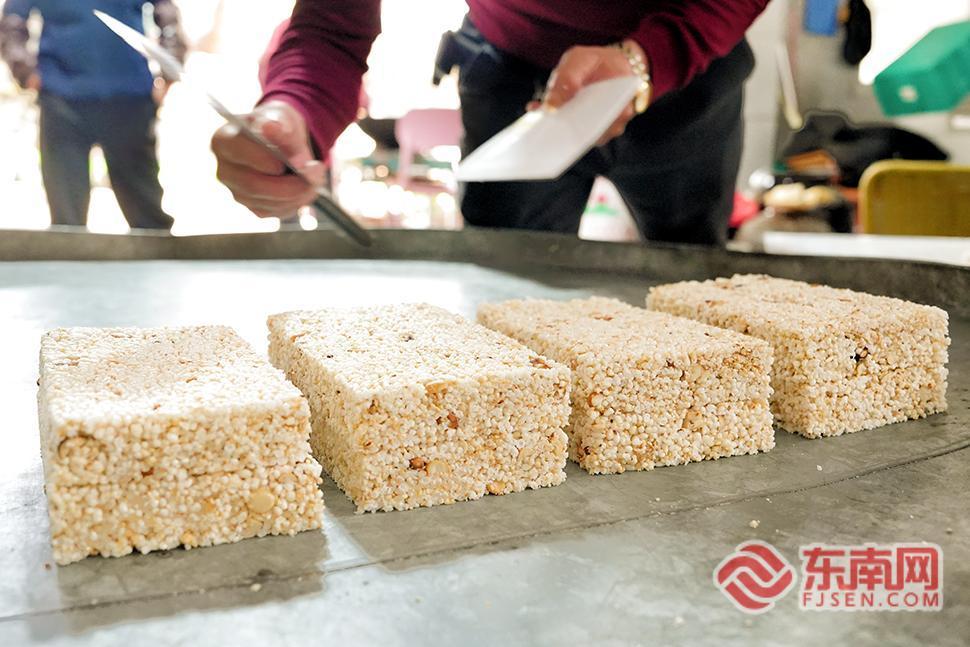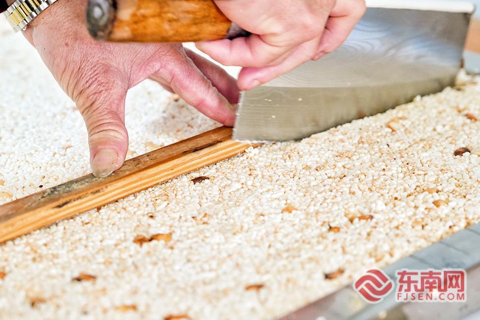 最考验手艺的,是熬糖。麦芽糖与白砂糖在水中渐渐融化,由锅中慢煮成浆。手持筷子不停搅动,全凭经验观察糖色的转变与稠度的变化——直至糖汁金黄透亮、黏稠拉丝,方是火候到位之时。“最重要就这个煮糖水,要煮到有牵丝才可以。”正如居民温月兰所说,这一“牵丝”的瞬间,是米腊尝酥脆不黏、甜而不腻的关键。待糖浆熬好,迅速倒入事先炒香的米花、花生与芝麻,快速翻炒均匀,趁热倒入模具,压平、压实。冷却定型后,切分成块,一块块金黄酥脆、嵌满果仁的米腊尝便新鲜出炉,甜香四溢。