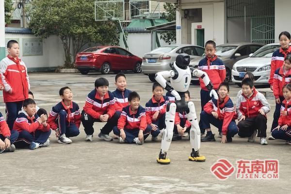 鼓点激昂,奏响新春的热闹序曲。黄林率先登场,一招短桥寸劲刚劲有力,步步稳健章法井然,将连城拳攻守兼备的独特韵味展现得淋漓尽致,千年非遗的魅力扑面而来。随后,身高约1.2米的人形机器人“武连”踏着铿锵节拍稳步上台,依托AI的精准动作模拟与运算,起势、冲拳、踢腿,一举一动虽带着机械之躯的硬朗,却分毫毕现地复刻出连城拳的招式精髓,灵动间尽显武术韵味。传统非遗与AI科技的跨界融合,让现场师生连连喝彩,掌声与欢呼声交织成新春里最鲜活的文化乐章。 “第一次看到AI机器人练连城拳,太新奇了,这是最特别的体验!”隔川中心小学学生陈立源难掩兴奋,道出了现场师生的共同感受。