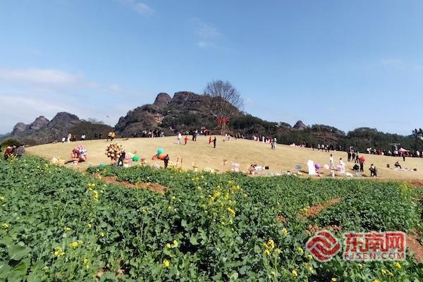 东南网龙岩2月18日讯(通讯员 黄水林)“冠豸山的景美,草山的年味更浓!”“快看,我的风筝要飞到山顶啦!”2月18日,大年初二,暖阳铺洒闽西大地,龙岩市连城县冠豸山下的网红草山在姑田大龙、油菜花的映衬下,成了欢乐的海洋,马年新春的喜庆气息扑面而来,市民游客相约于此打卡游玩,欢声笑语在软嫩的草地上久久回荡,绘就出一幅生动热闹的新春休闲画卷。