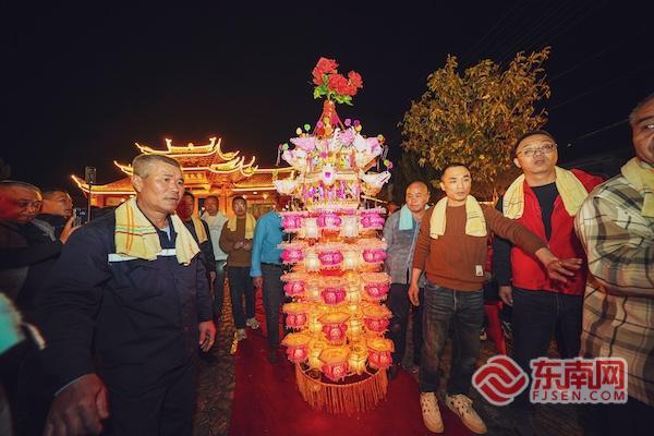 作为国家级非物质文化遗产,芷溪花灯有着“纸做灯、油点灯、纸包火”的特色,历经数百年传承,凝聚着客家先民的匠心与智慧。每一盏花灯均以竹篾为骨架,表面仅糊着薄薄一层纸,内部却藏着实实在在的明火,由99盏小灯组成,点亮后晶莹剔透、璀璨夺目,完美演绎着“纸包火”的奇迹。竹编、剪纸、绘画、裱糊等多种技艺的交融,让每一盏花灯都成为一件精美的手工艺品。 芷溪村一直沿用姓氏轮流承办花灯节的传统,8年为一轮,今年恰逢黄姓出灯。据悉,每一盏花灯的巡游都需要二三十名村民默契配合,抬灯的村民轮换接力、步伐稳健,看灯的村民簇拥相随、欢声笑语,花灯节早已成为凝聚宗族情感、增进邻里情谊的重要盛会,今年的93盏花灯更是点燃了全村人的新春热情。