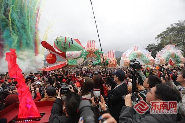 庄重的传统起龙仪式,为这场盛会拉开序幕。故宫博物院第六任院长、中国文物学会专家委员会主任单霁翔,福建省文化和旅游厅党组成员、副厅长傅柒生,共同为巨龙点睛,朱砂落定,祥龙金睛骤然焕彩,焰火直冲天空,绚烂夺目。随着长者一声铿锵有力的“起龙!”,上千名青壮年合力抬龙,肩扛木架、脚步齐整,千米巨龙应声昂首摆尾、俯身腾挪,巡游的大幕正式拉开。在锣鼓队、灯箱队的引领下,长龙蜿蜒前行,龙身之上,党风廉政、综治平安、移风易俗、禁毒反诈等主题宣传内容融入其间,让千年民俗与时代新风交相辉映。 巨龙盘旋在阡陌纵横的田野间、沟壑纵横的山林间,墨色的田埂、曲折的山路成了巨龙的舞台,千米龙身在暮色中舒展蜿蜒,时而昂首向上、似欲腾空,时而俯身游走、宛若穿波,勾勒出一幅龙行沃野的壮美画卷,田埂两侧的村民踮脚相望,欢呼声随着龙身的移动一路蔓延。 行至古镇街巷,巨龙更是尽显灵动,古街巷道蜿蜒曲折,却挡不住大龙的磅礴气势,上千名抬龙汉子默契配合,或抬龙登高、或俯身转巷,龙身贴着古厝白墙缓缓游走,鳞爪翻飞间,带起阵阵欢呼,古街的青石板路被人声与龙影填满,祥龙所过,家家户户门前张灯结彩,老少相携出门观龙,福运满巷、春意融融。