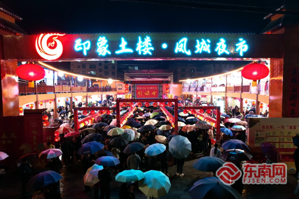 夜幕降临,细雨如丝,永定区土楼印象·凤城夜市华灯初上,千幅谜笺随风舒展,五彩斑斓的花灯在雨雾中晕开暖黄光晕,将现场装点得流光溢彩又添朦胧诗意。来自该区的职工群众、市民游客携家带口,撑着各色雨伞涌入灯会现场,在灯海谜阵中穿梭。