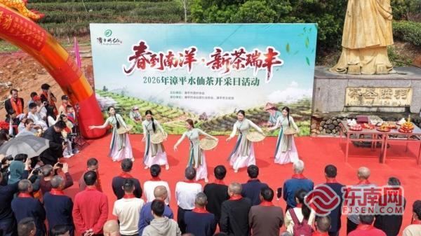 东南网龙岩4月6日讯(通讯员 杨丹丹 黄聚杰 记者 江雅萍)茶园吐翠,春和景明,又逢一年新茶飘香时。4月4日,“春到南洋·新茶瑞丰”2026年漳平水仙茶开采日暨“文艺下基层助力非遗”活动在漳平市南洋镇北寮村陆羽广场举行。 活动伊始,茶农、非遗传承人代表共同祭拜茶圣陆羽,以此寄托新一年茶叶丰收、产业兴旺的美好愿景,并集体承诺坚守非遗技艺,传承千年茶文化根脉。现场还举行了水仙茶宣传片发布仪式,用镜头全方位展现漳平水仙茶的独特魅力与产业风采。