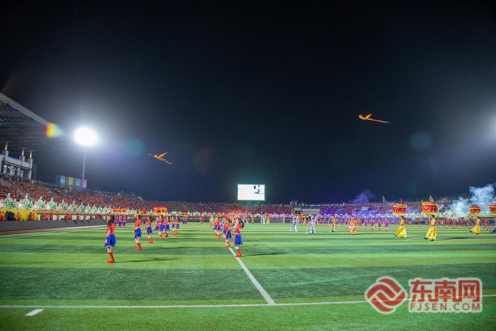 在当晚开幕式主题演出《燃动绿茵》环节,本土特色节目轮番上演,尽显闽西独特魅力。99节姑田游大龙作为开篇非遗重头戏,率先浩荡入场,巨龙盘旋环绕体育场一周,行云流水的龙阵气势磅礴,瞬间将现场气氛推向首个高潮;紧随其后的是客家非遗舞蹈九连环,搭配本土原创歌曲《长汀来liao》同步表演,精巧的舞蹈动作与饱含乡情的歌声完美融合,尽显非遗韵味与长汀地域情怀;欢快的舞姿搭配激昂铿锵的鼓点,非物质民俗表演《大鼓凉伞》火热上演,尽显民俗文化的热闹与活力。